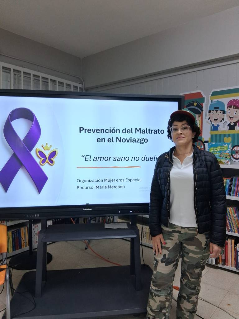 Durante la puesta en escena, nuestra portavoz y líder comunitaria, María Mercado, interpretó el papel de un agresor, denominado “Simón”, con el propósito de visibilizar conductas de maltrato, control y manipulación emocional que pueden manifestarse en una relación afectiva. Esta dramatización permitió enfatizar señales de riesgo que no siempre se reconocen a tiempo, tales como los celos excesivos, la desvalorización constante, la presión psicológica, el aislamiento social y las prohibiciones en el uso de redes sociales o amistades.